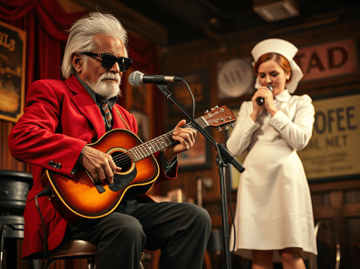 The nurse gently seats the old gentleman in a chair provided by Wino 1 and lowers the large silver microphone to a height between his face and his guitar. She then stands to the side of the stage, just out of the spotlight. Blind Jelly Roll starts strumming his guitar like he’s hammering a ten-penny nail. Thick, viscous down strokes with note-bending riffs in between. His frail body rocks with every note he coaxes out of his tortured instrument. He leans into the mic and sings,